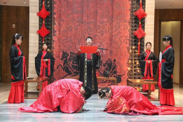 下午15点30分,汉式婚礼正式开始。在主礼官请新婿新妇入华堂后,依次举行了弃扇礼、入堂传代礼、沃盥礼、对席礼、同牢礼、合卺礼、结发礼、交拜礼、执子礼等礼仪,在新婿新妇向宾客行礼后,婚礼结束。整场婚礼在庄重喜庆的音乐中进行,同时此次婚礼的布景、道具全部以汉代形制为准,尊古而不泥古,彰显汉式特色,以此弘扬传统婚礼文化。