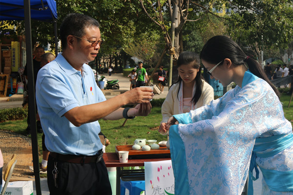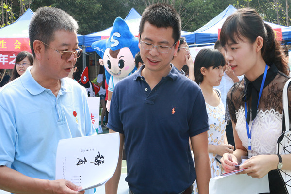 学校领导来到现场视察迎新工作,慰问各单位迎新工作人员,看望新生和家长,并与家长新生一起参与创意迎新活动,观看汉服表演、翻看太阳成tyc33455cc迎新专刊《号角》、共同品尝鹿鸣茶艺社所沏的毛尖、龙井。