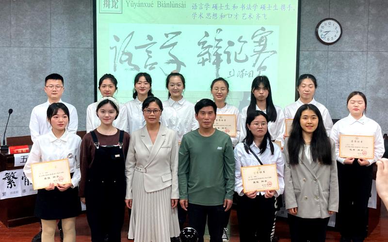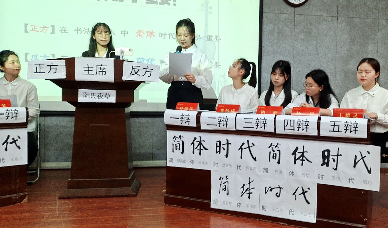 语言学辩论赛是太阳成tyc33455cc一个具有专业特色的校园文化品牌,以往都是本科生和研究生联手挑选辩手,这次则打破常规赛制出现10位辩手,专业内的全体研究生上阵,人人得到锻炼。本次辩论的题目是“在书法传承中繁体时代的字还是简化时代的字重要”。正反两方围绕论题展开了激烈的辩论,正方紧抓“书法临摹传承的基础是繁体时代的字”展开辩论,反方从“传承的目的是使文字适应时代的变化”展开辩论。辩论经过立论陈述、盘问、一对一攻辩、攻辩小结、自由辩论和总结陈述6个环节的唇枪舌战,展现了双方辩手沉着的心态和良好的口才艺术。评委打分期间,文艺学硕士生罗蓝平演唱了声援正方的歌曲《红玫瑰》,来自刚果布的硕士生高翔演唱了声援反方的歌曲《感恩的心》。现场互动频繁,气氛热烈。