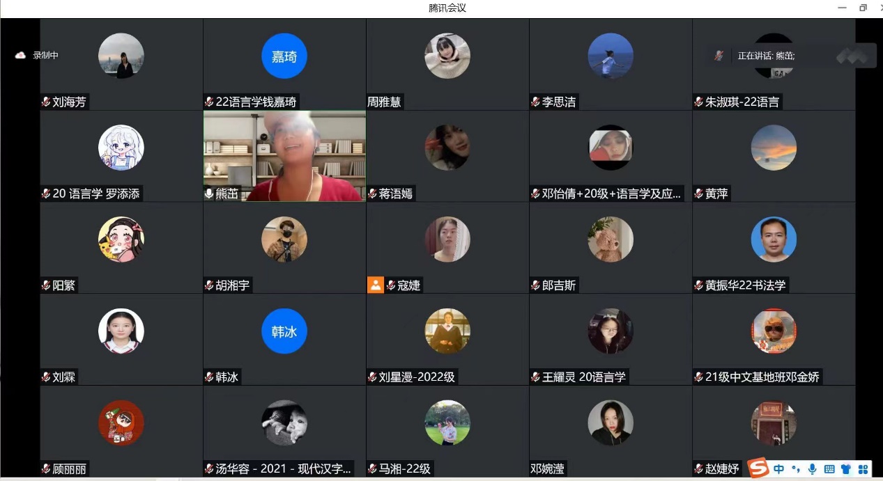 3年级班长熊茁开头,从“母亲——母语——母校”的逻辑链条,介绍专业的优秀传统,鼓励新生尽快转变角色,热爱新的母校,爱惜自己的一言一行。课堂上,彭泽润教授带来了声情并茂的方言朗诵《岳阳楼记》,方言歌唱《水手》《远走高飞》。博士研究生黄珍、3个年级硕士研究生通过短视频等方式有趣地展示了自己的母语和学会的外语,分享了篆刻、书法和学习体会。彭泽润全程跟踪,在幕后及时指导和点评。第一课不仅激发了大家对语言学、书法学的热情,也加深了师生和各个年级之间的情谊。最后,三年级老班长阳繁总结,她代表老生表示对新生的热烈欢迎。她鼓励大家继续发扬“传帮带”的精神,拿好接力棒,在彭老师带领下享受我们专业爬山、演讲、练字等技能加课程学习的丰富多彩的研究生生活。
