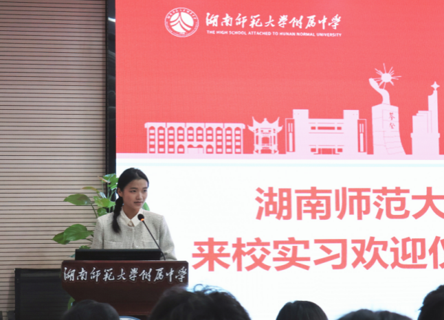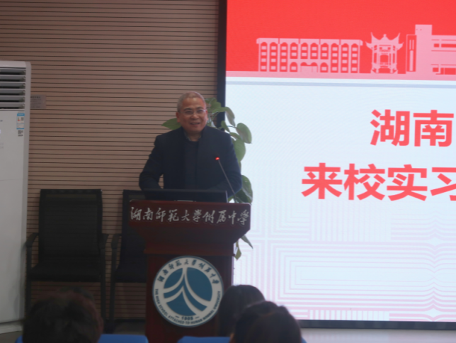 会议由湖南师大附中课程与教学处副主任王建主持,湖南师大附中副校长苏建祥致欢迎词。苏建祥介绍了学校历史和基本情况,勉励实习老师珍惜实习时间,高标准、严要求地完成实习任务。实习生代表、实习队队长柳刘表示:“希望这一段即将到来的宝贵且注定精彩的实习生活,能够化作我们人生一段感恩与庆幸、奋斗与勉励交织的注脚,将最纯粹的热爱凸显。”带队老师黄耀红教授向附中领导和老师表示感谢,他寄语实习老师,要知“乐”、知“新”、知“行”,珍惜学习平台,以最勤奋的姿态来开启自己的实习生活。附中课程与教学处副主任王建老师对实习队的工作纪律和内容提出明确要求。