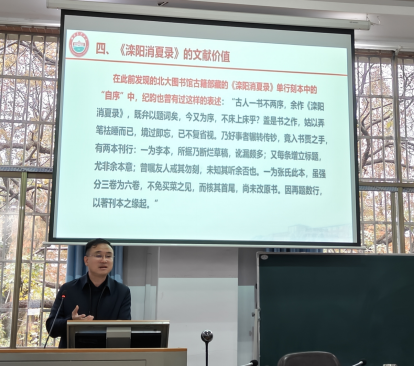 接着,吴波教授以自身多年对《阅微草堂笔记》的研究成果为基础,从“《阅微草堂笔记》概况”“《阅微草堂笔记》版本研究”“《滦阳消夏录》单行抄本来历及传播”“《滦阳消夏录》的文献价值”四大方面入手,为在场师生带来了一场妙趣横生、内容充实的学术盛宴。