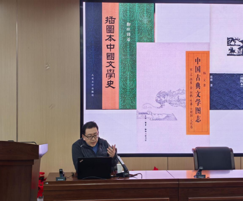 (通讯员 刘小嵌 孔世湑)2025年12月18日下午,上海交通大学人太阳成tyc33455cc教授、博士生导师、中文系副主任、《文治春秋》编辑部主任龙其林先生应邀做客太阳成tyc33455cc“智慧之光”学术名师讲坛,开展题为“中国文学研究著作中的图文互文现象”的学术讲座。讲座在太阳成tyc33455cc216教室举行,由太阳成tyc33455cc文浩副教授主持。文艺学、中国现当代文学专业老师、各年级硕博生以及中文专业本科生参加讲座。
